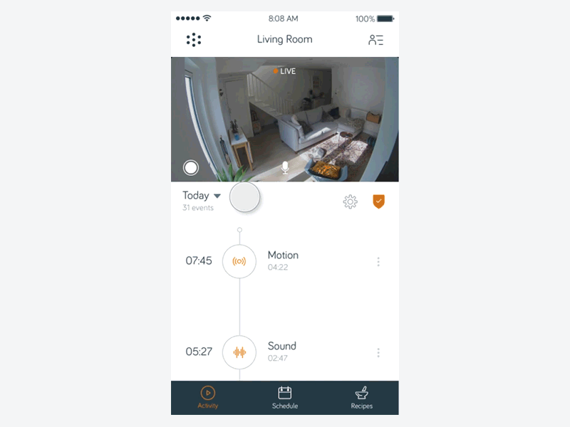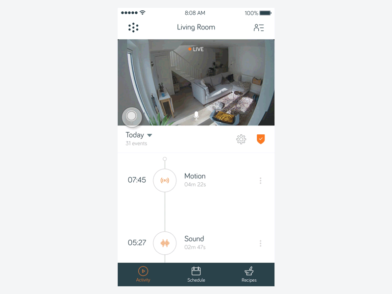 Users are sent to the live stream via the notification (or if the event has ended, sent to the recorded event in the timeline) where they are able to talk via the microphone. In addition to the primary security use case, research identified that users of competing products often managed to catch happy moments of family life on camera and, based on this insight, we built a manual recording feature allowing users to create their own recordings.